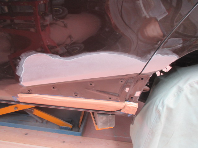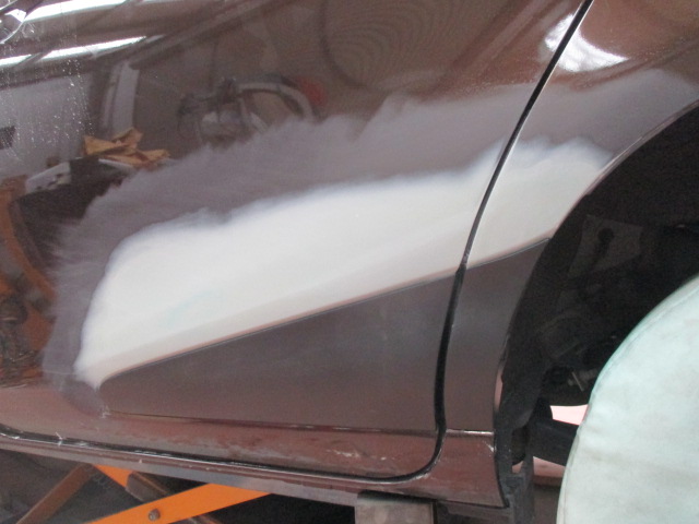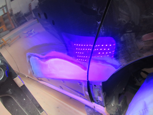 修理したむき出しの鋼板に直接パテを塗るわけではなく、専用のプライマーを塗装して乾燥させます。その上にパテを塗り、最終的にサフェーサーで下地を完成させます。当店ではプライマーとパテ、サフェーサー全てがUVタイプを使用しています。通常のパテなどとは違い、きめが細かく密度の高いパテとサフで下地を作る事が可能で、とても硬い膜が作れます。