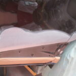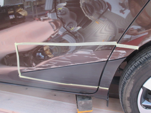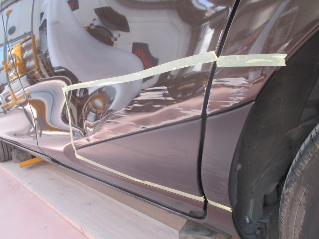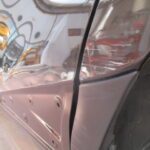 左のリヤドアから後方にかけてはどうしてもぶつけてしまう方が多い部分で、特にシエンタのこのモール付近への損傷が多い気がします。この黒い樹脂モールはデザインとしてはアクセントとなり良いものかもしれませんが、この様な凹みを修理する際はとても難しくなります。それは新品モールをつけた際にボデーラインの曲がりや隙間など鈑金の不備が目立つ部分だからです。