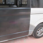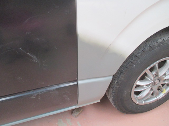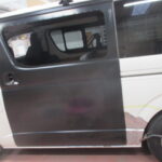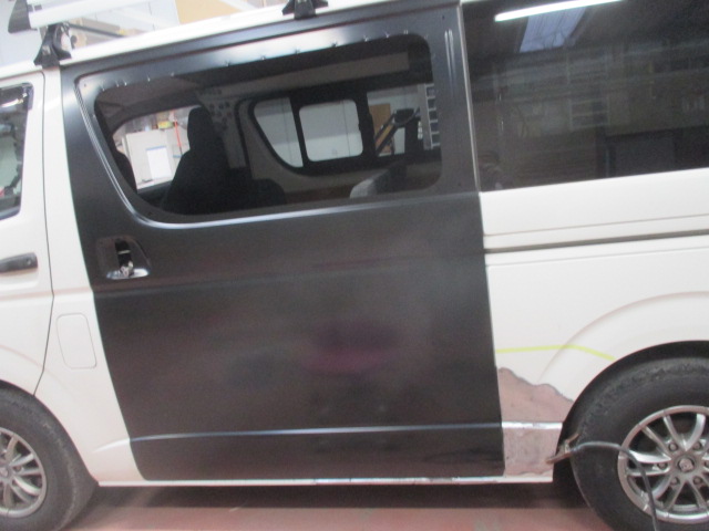 埼玉県さいたま市のハイエースバン様よりスライドドアからクオーターパネルにかけての大きな凹み修理のご依頼です。派手にぶつけてしまいました(;^_^A