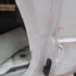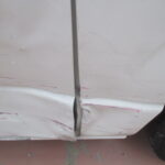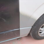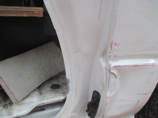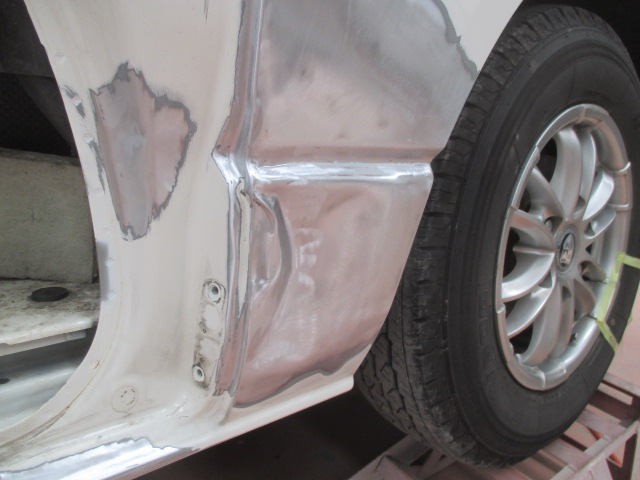 営業車という事で時間もなく、なるべく早い修理をご希望という事でした。スライドドアはボルトで固定されている部品なので交換がスムーズにできますが、リヤクオーターパネルは溶接パネルの為交換は時間もコストも大きくなってしまいます。そこでリヤクオーターパネルは鈑金で直す事に致しました。ご覧の様に鋼板が潰れて伸びて後方に移動している損傷なので鈑金作業も大変困難なものになりました。
