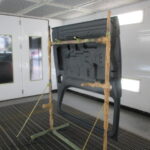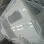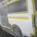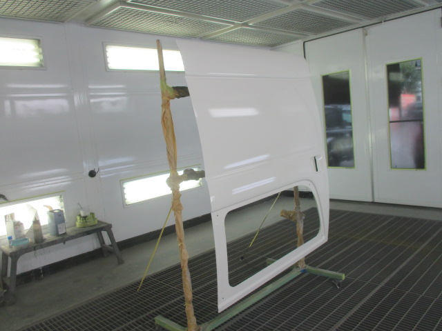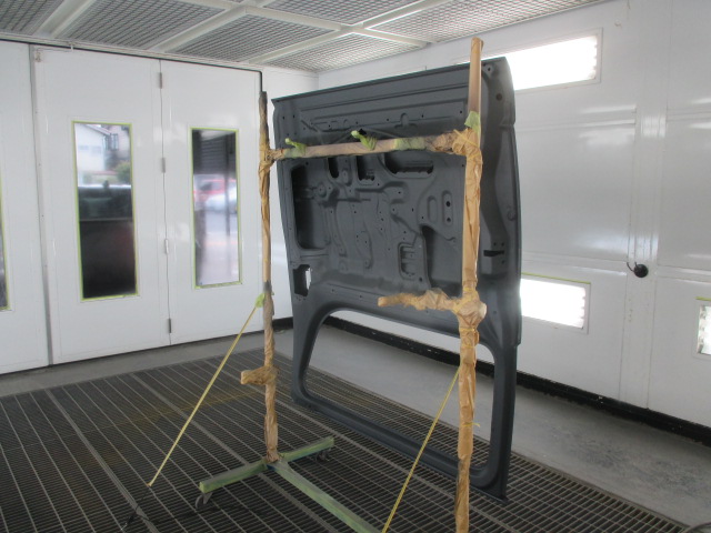 新品ドアは下地用にサフェーサ塗装を行い密着性と耐久性を高めてから上塗りを行っています。ボデーもこの様にマスキングを行いパネル全てを塗装して仕上がりです。